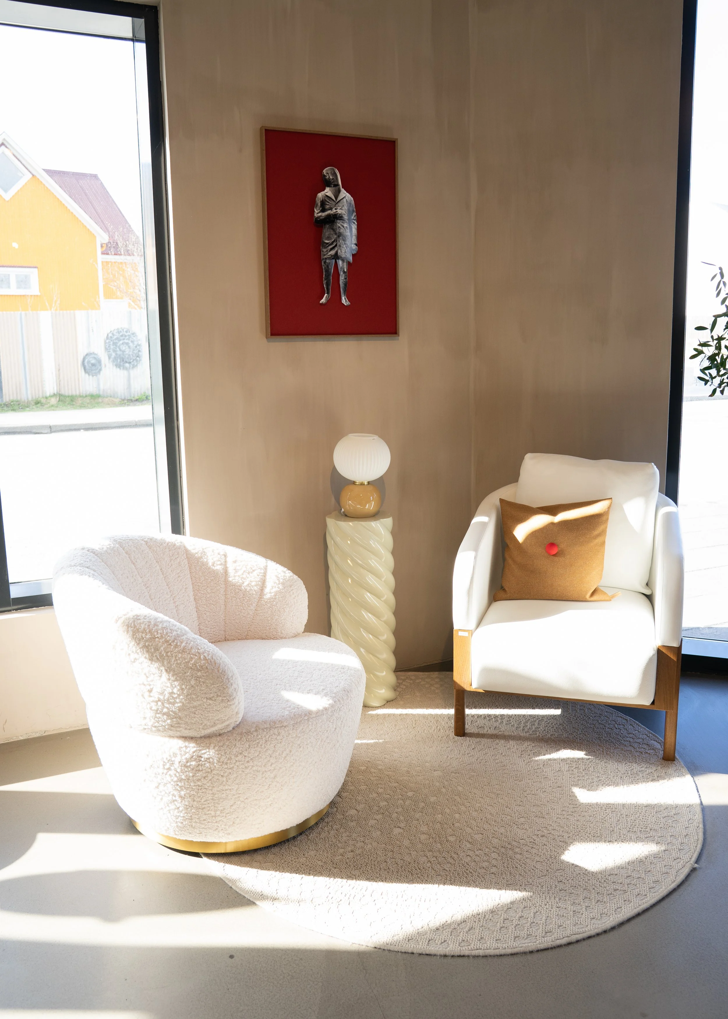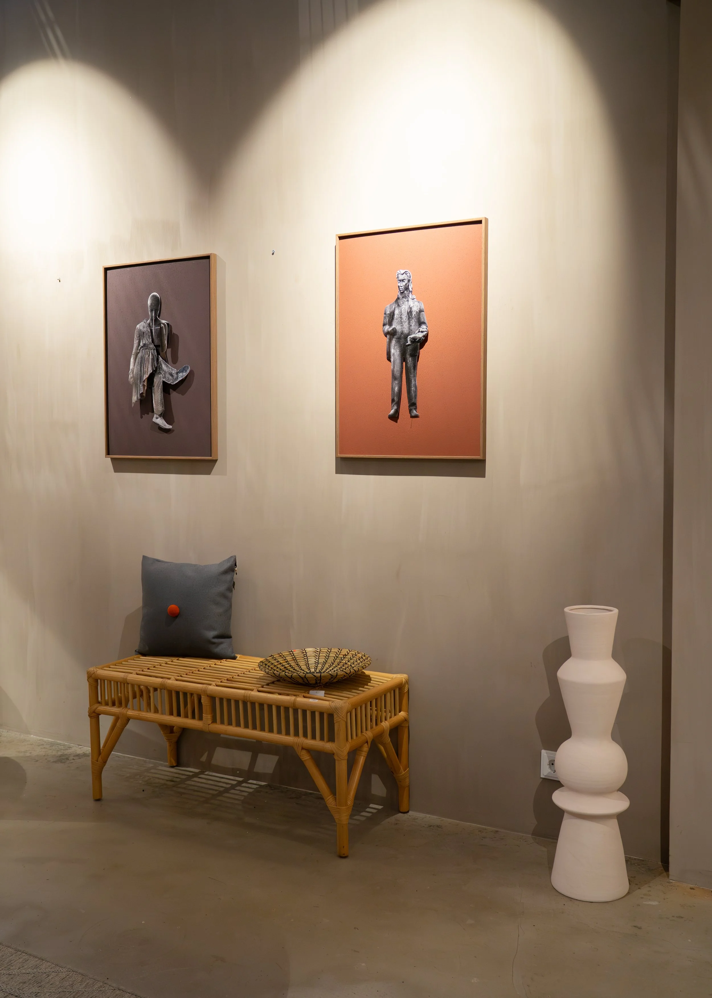 Nine collage bw photographes. Pinned on a hand painted cork, framed in a walnut frame. Two 3d printed statues presented on a walnut pillar.