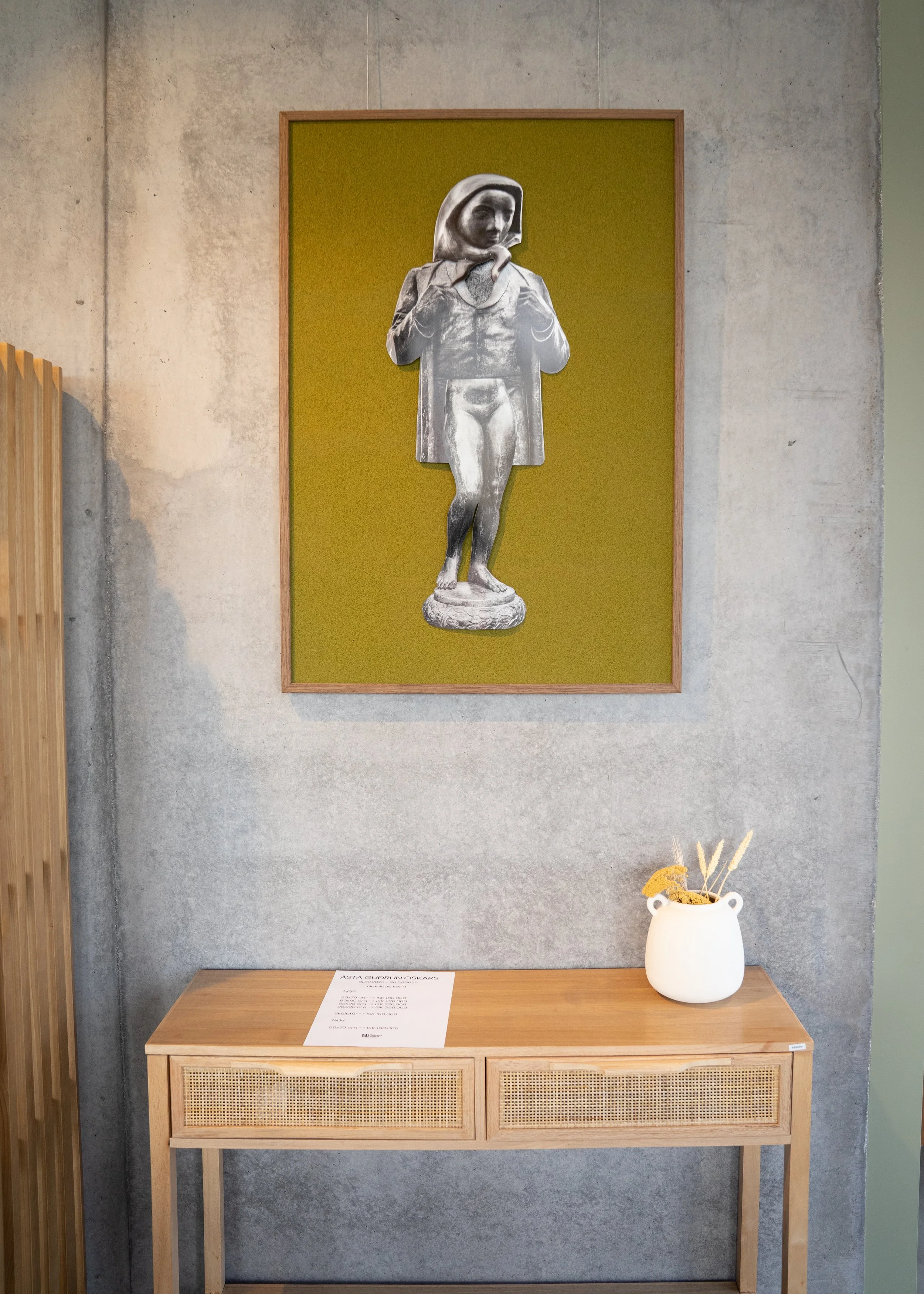 Eight collage bw photographes. Pinned on a moss green painted cork. In front of the collages stands a 3d printed statue on a walnut pillar. I wanted to bring one of my collage to life by turning it into a physical form.